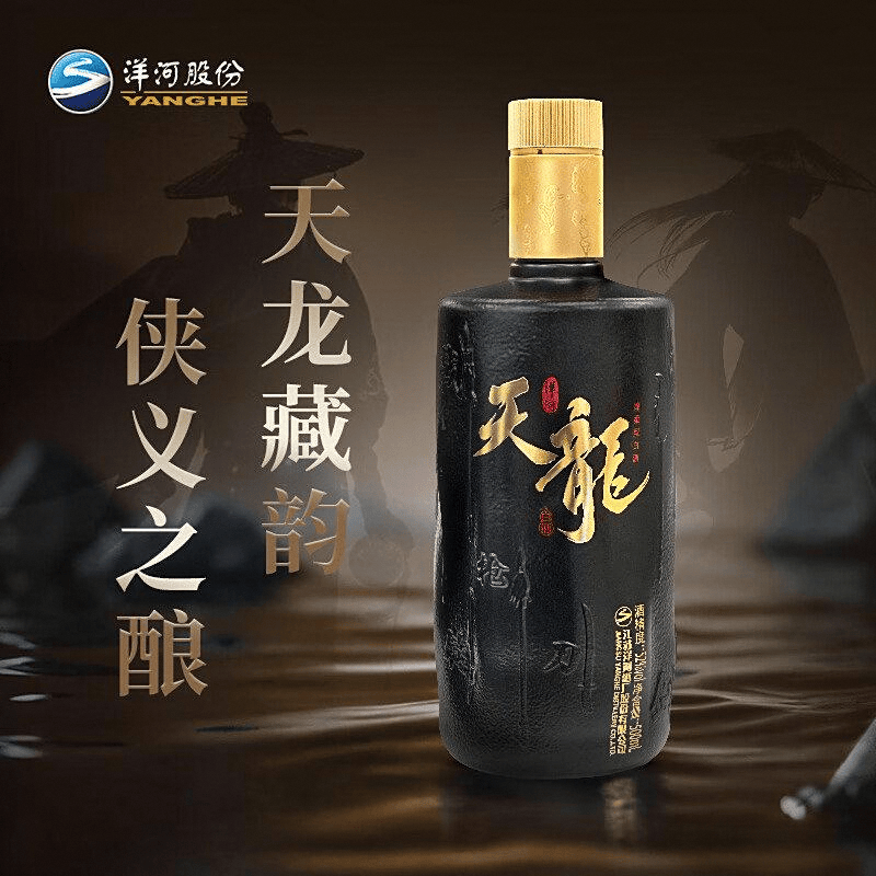 此外,洋河天龙的瓶身设计也颇具特色,通体黑色的瓶身融入了武器元素,雕刻着传统的兵器图案,金色瓶盖的点缀更是增添了收藏价值。